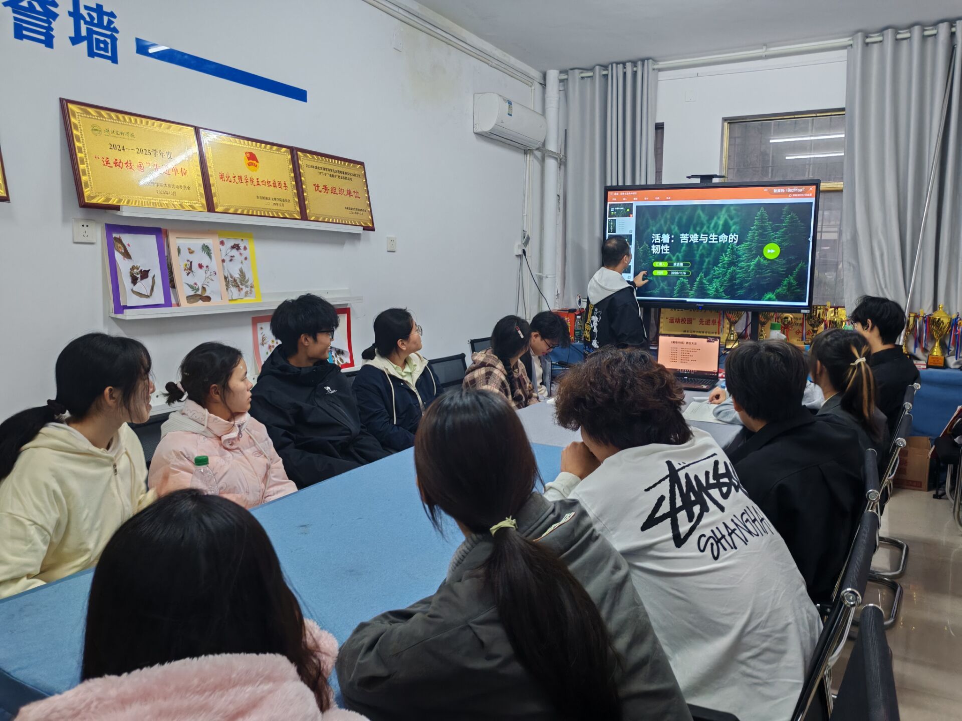随着交流的深入,余志强巧妙地从叙事艺术、历史背景、人物塑造这三个关键维度展开论述,层层递进地剖析《活着》这部作品的精髓。他绘声绘色地讲述了地主少爷福贵在历史洪流的无情裹挟下,命运如何急转直下。从原本富足安逸的生活,到接连失去财富、地位,直至所有亲人相继离世,晚年只剩下一头同样年迈的老牛与他相依为命。在讲述过程中,余志强特别动情地引用了书中的经典语句:“活着不需要宏大的理由,人活着本身就是为了活着,而不是为了活着之外的任何事物所活着。命运可以摧毁你的一切,但无法摧毁你‘承受’和‘继续’的意志。”这番话语,如同一束强光,穿透黑暗,直击同学们的心灵,让大家深刻感受到“活着”背后所蕴含的强大精神力量。在活动的尾声,余志强点明《活着》的核心要义并非在于“死亡”,而在于“活着”本身这一深刻主题。他指出,余华以极其冷静、甚至近乎残忍的笔调,一次次描绘死亡场景,其目的恰恰是为了通过强烈的对比,反衬出“活着”的坚韧与力量。这种独特的创作手法,让同学们对生命的意义有了更为深刻、透彻的理解。